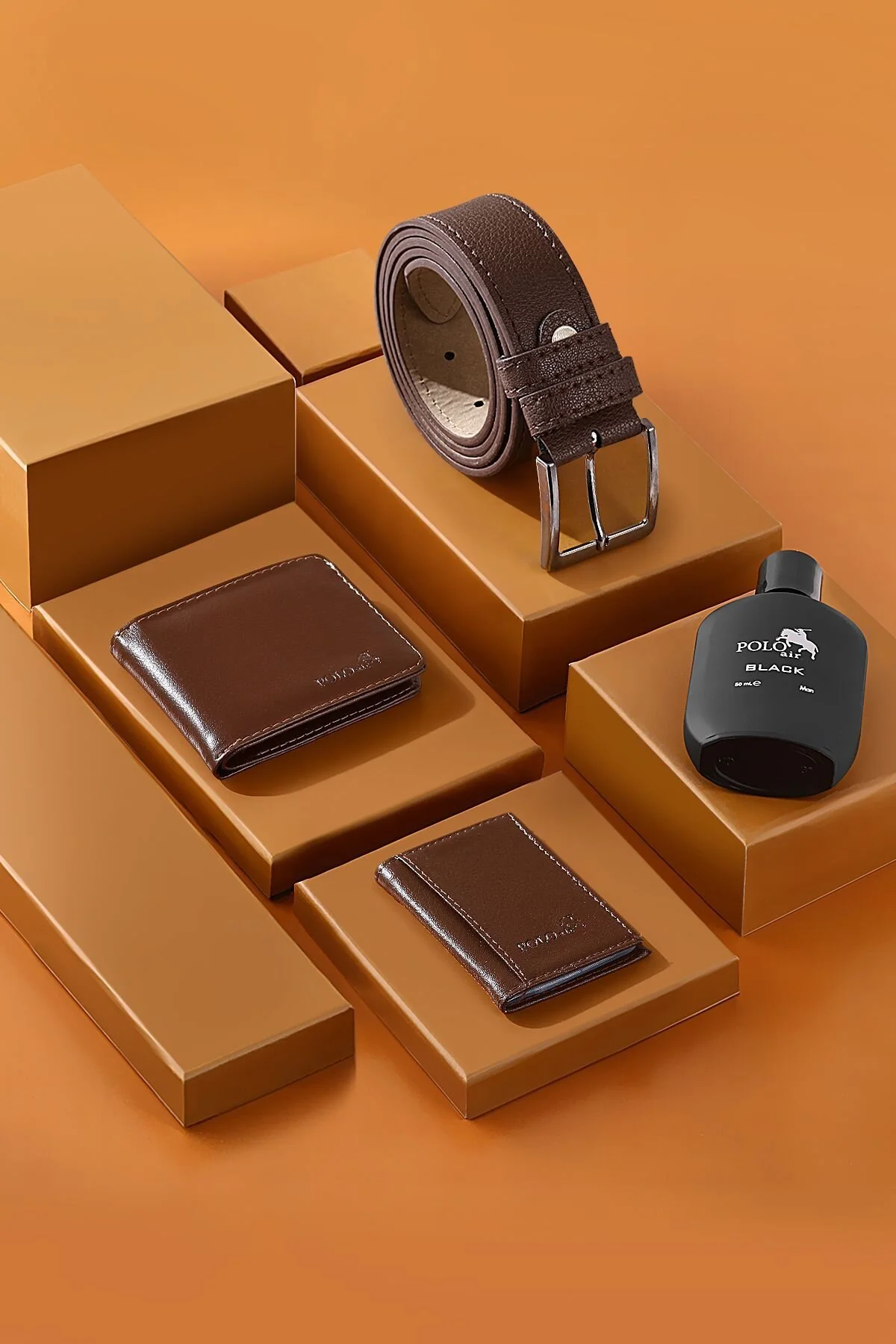 ست ساعت مچی مردانه، عطر، کیف پول و کمربند رنگ مشکی و مسی مدل PL-0918E4