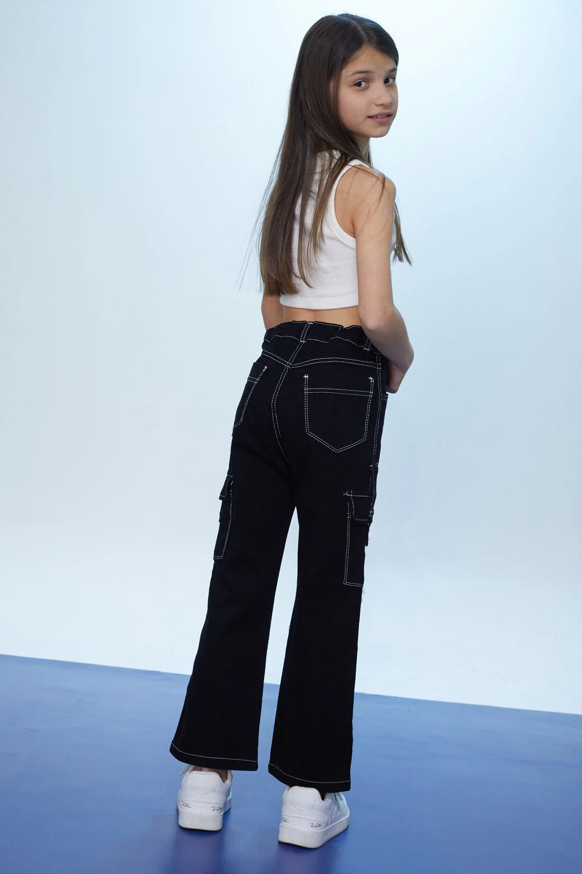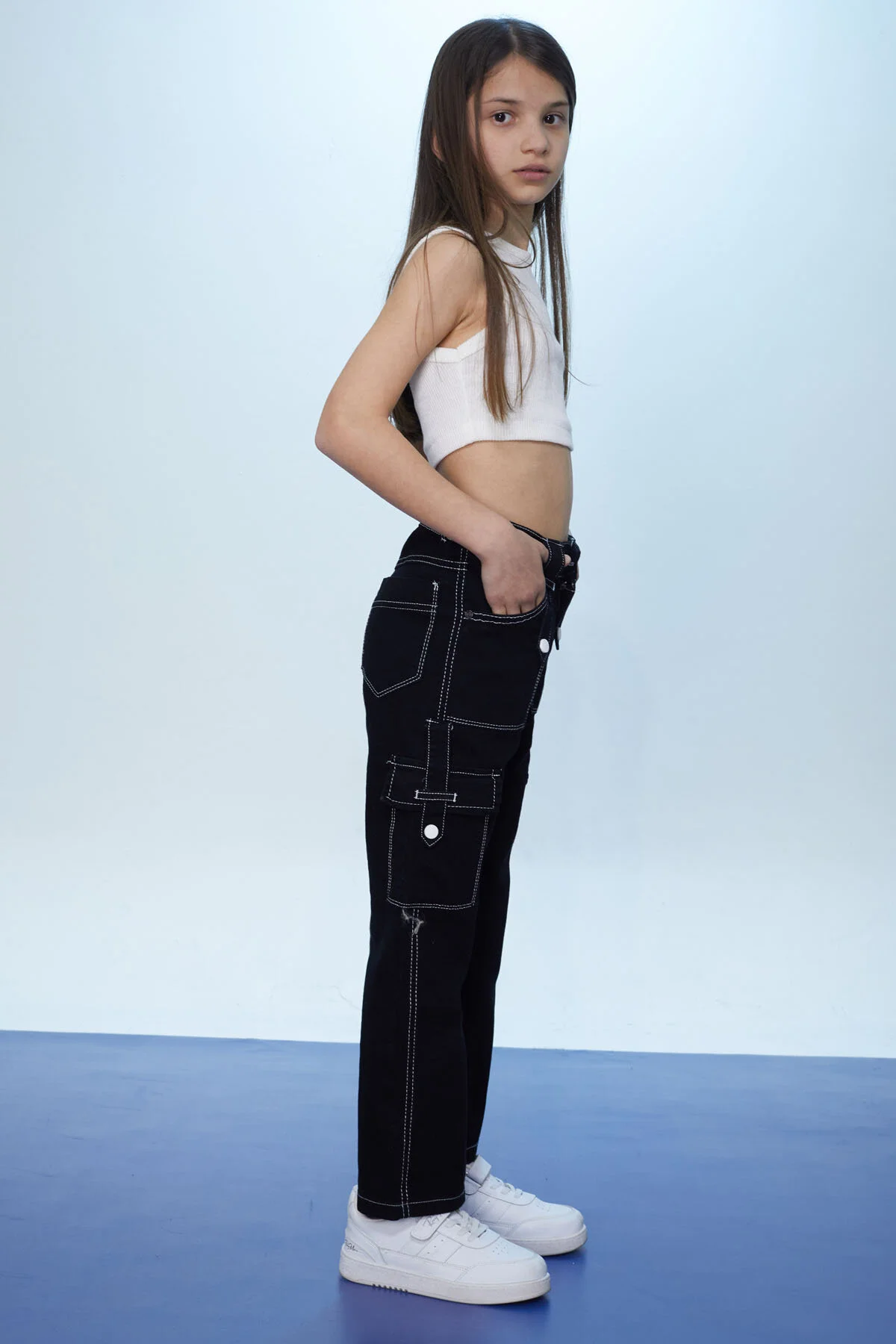 شلوار دخترانه کمر بلند مشکی با جیب و دوخت سفید Cansın Mini 18365