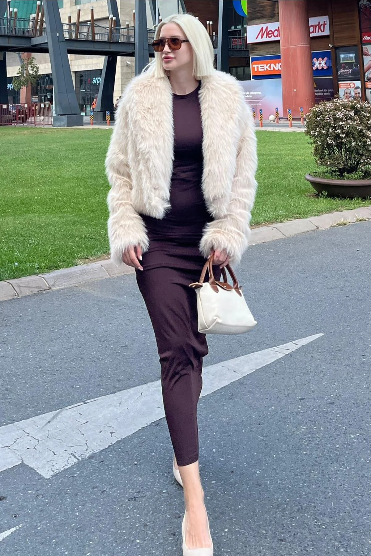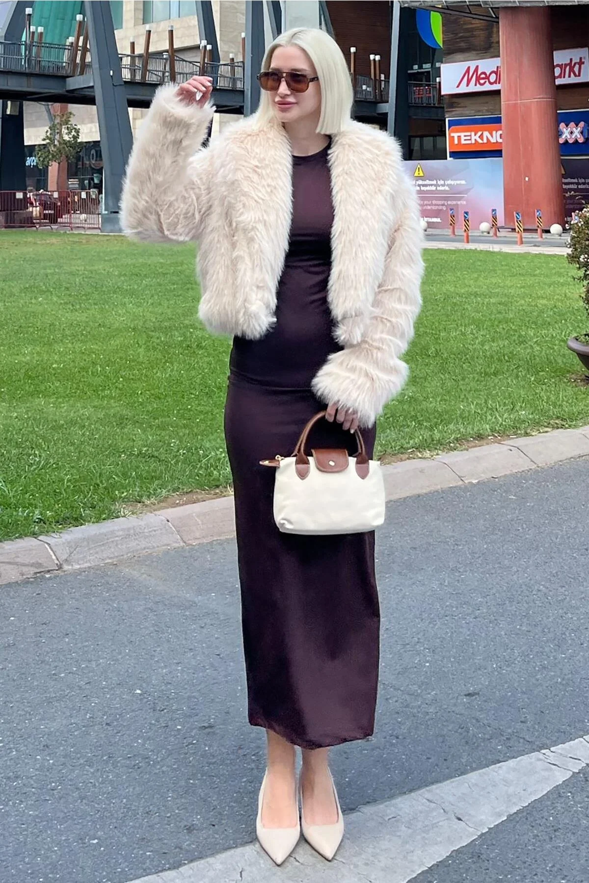 پالتو زنانه مادمکس با یقه کروات و پارچه نرم به رنگ بژ MG2175