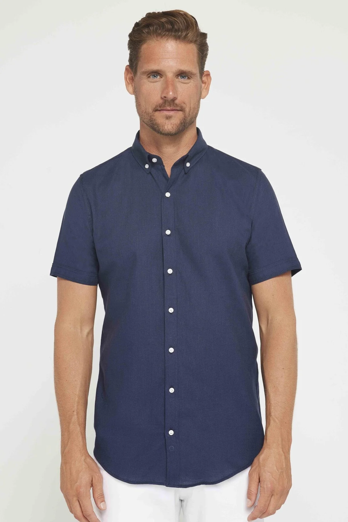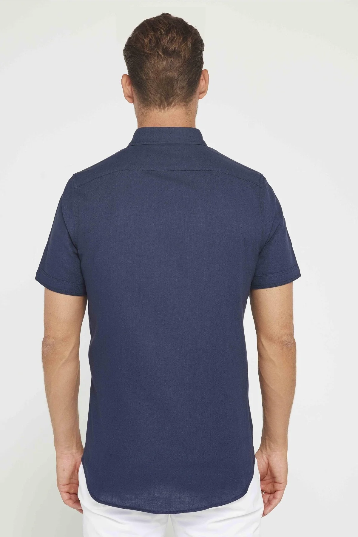 پیراهن مردانه آستین کوتاه تنگ Tudors از 100% پنبه و کتان با یقه دکمهدار رنگ سرمهای