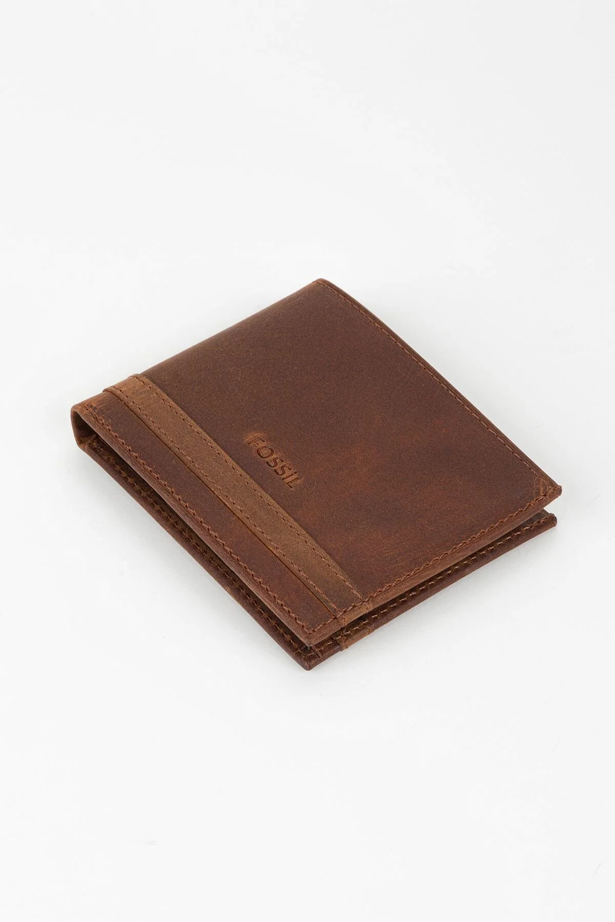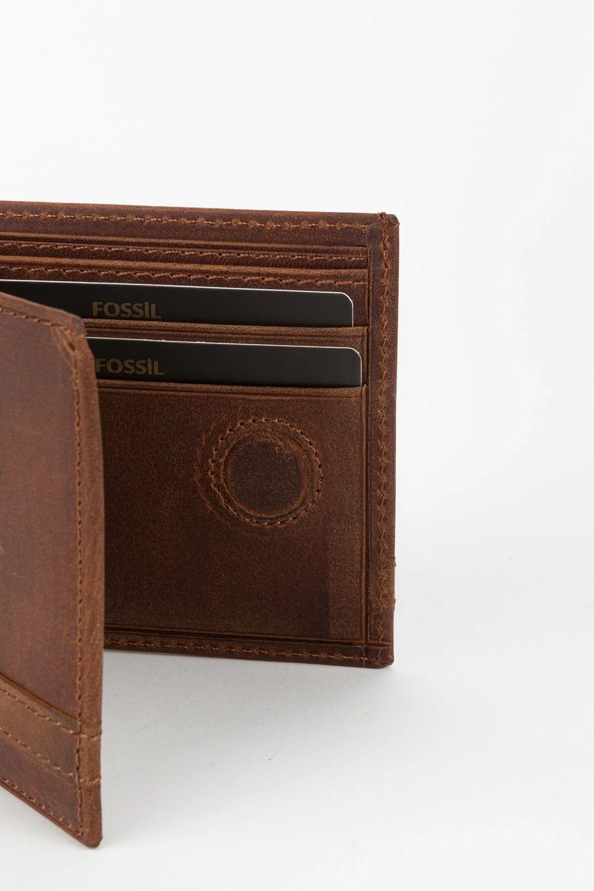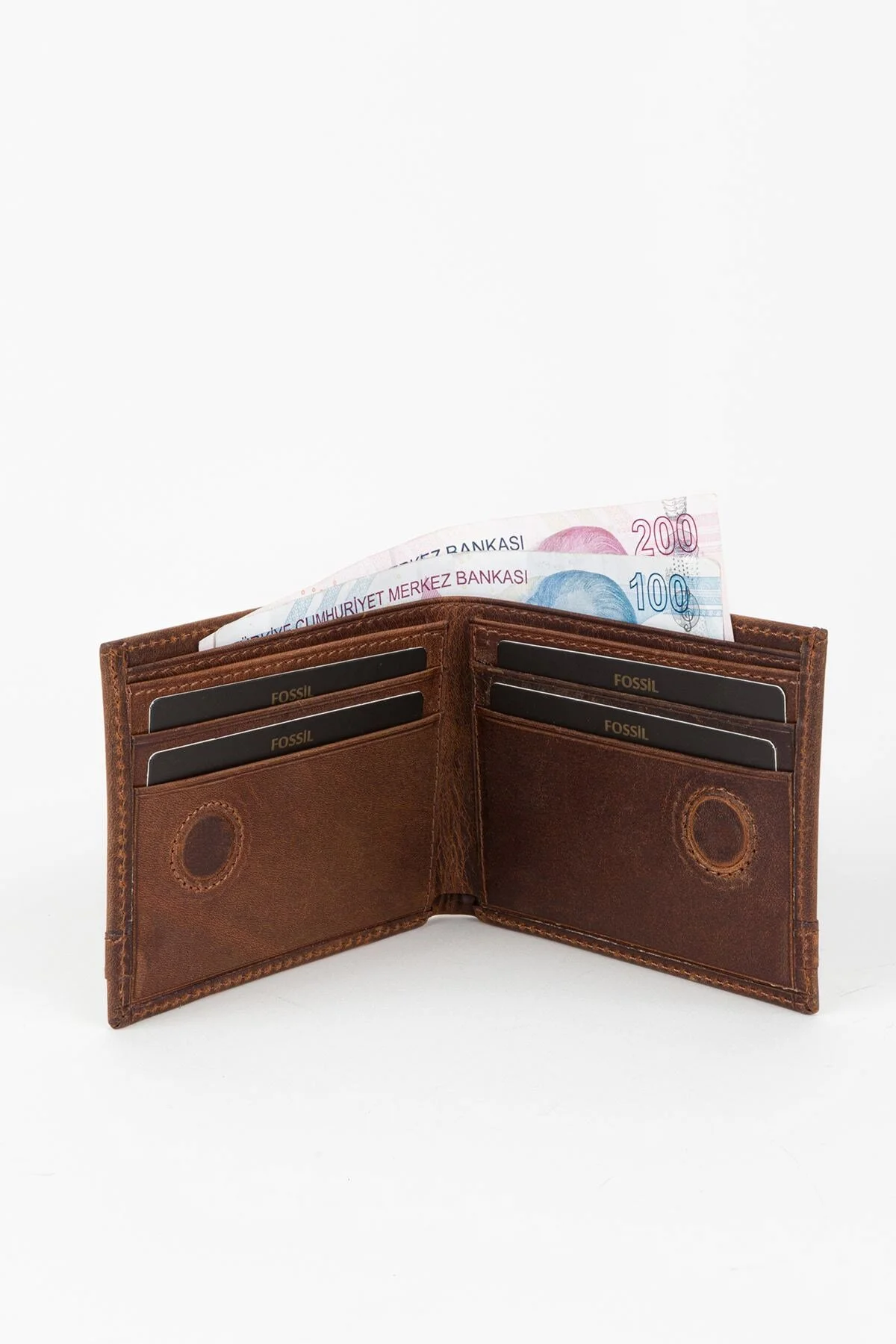 کیف پول مردانه Fossil از چرم طبیعی قهوهای با طراحی افقی و در بستهبندی